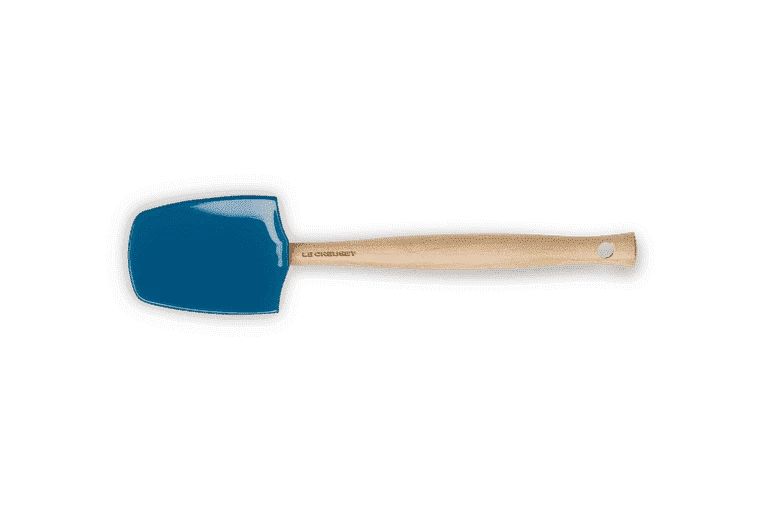 De donker groenblauwe Le Creuset grote spatel is gemaakt van hout en heeft een siliconen blad, waardoor de spatel niet krast. De spatel heeft een platte en bolle zijde en heeft een lengte van 28 cm. De breedte van het blad is 7 cm.