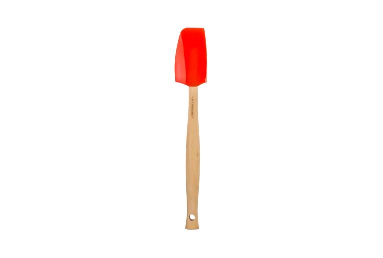 De vulcanique Le Creuset kleine spatel is gemaakt van hout en heeft een siliconen blad, waardoor de spatel niet krast. De spatel heeft een platte en bolle zijde en heeft een lengte van 28 cm. De breedte van het blad is 4,5 cm.