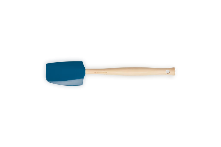 De Le Creuset Premium Medium spatel is gemaakt van hout en heeft een siliconen blad in de kleur Deep Teal, waardoor de spatel niet krast. De spatel heeft een platte en bolle zijde en heeft een lengte van 28,5 cm. De breedte van het blad is 5,8 cm.