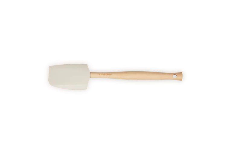 De Le Creuset Premium Medium spatel is gemaakt van hout en heeft een siliconen blad in de kleur meringue, waardoor de spatel niet krast. De spatel heeft een platte en bolle zijde en heeft een lengte van 28,5 cm. De breedte van het blad is 5,8 cm.