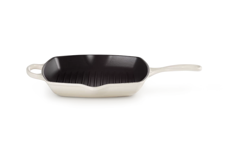 De skillet van Le Creuset is een vierkante grillpan met een vaste handgreep. Deze pan is gemaakt van geëmailleerd gietijzer in de kleur meringue, heeft een tegengreep en twee schenktuiten. De grillpan is 26 x 26 cm en heeft een totale lengte van 44,5 cm lang. Gebruik de grillpan voor het grillen van vlees, vis en groenten.