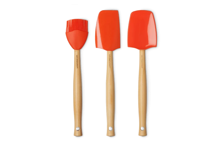 De oranje Le Creuset spatelset is gemaakt van hout en heeft een siliconen bovenstuk, waardoor de spatels niet krassen. De set bestaat uit een middelgrote spatel, een grote spatellepel en een bakkwast. Dankzij het flexibele materiaal reikt u zelfs tot in de meest moeilijk bereikbare hoekjes.