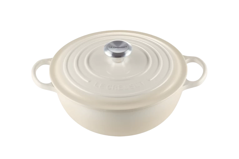 De Le Creuset wok-braadpan, ook wel marmite genoemd, is gemaakt van geëmailleerd gietijzer in de kleur meringue. De pan heeft een diameter van 26 cm en een inhoud van 4,1 liter. De pan is, zonder deksel, 10 cm hoog en heeft inclusief de grepen een breedte van 35 cm. De bodemdiameter bedraagt 13 cm. Door de ronde vorm van de pan is de wok-braadpan te gebruiken voor het bereiden van soepen, het bereiden van stoofgerechten en kunt u de pan gebruiken als wok voor het bereiden van roerbakgerechten.
